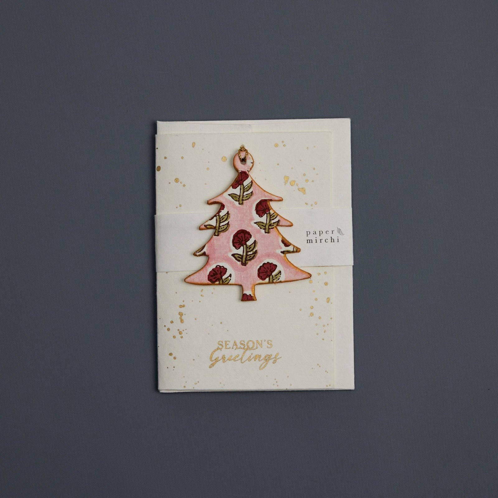 Keepsake Block Print Ornament Greeting Card - Tree Daisy Pink