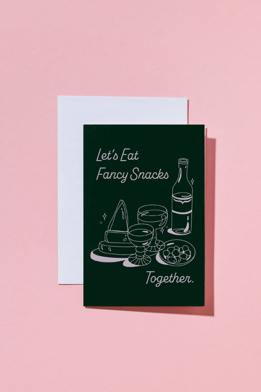 Let's eat fancy snacks together! Invite a cutie to a picnic, or a fancy birthday dinner, or a casual hang! Great for any occasion but a favorite choice for Invitations, Birthdays, and more! - Blank Greeting Card - 4.13" x 5.83" - Includes Kraft or White envelope. - Packaged individually in compostable cellophane sleeves.