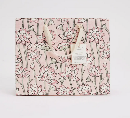 *Each gift bag is handmade using traditional block printing techniques, making every piece truly one of a kind. Variations in color, pattern, and even occasional ink splatters are part of the charm. A natural result of the artisanal process that reflects the hands that made it. These subtle imperfections are not flaws, but rather a beautiful reminder of the craftsmanship behind each bag.*