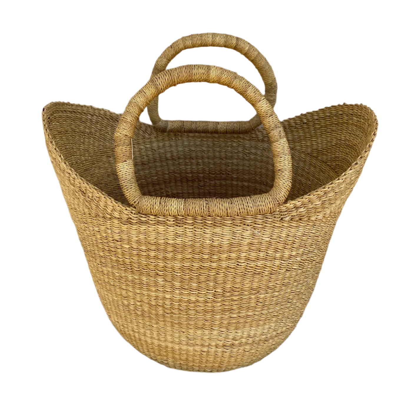 Each basket is expertly handcrafted using traditional techniques passed down from generation to generation by skilled weavers in Northern Ghana. Due to its handmade nature, variations in size and color are to be expected. The basket is round in shape, finished with a thick rim, and has two handles measuring 8-9 inches tall and 6-8 inches wide for easy handling while shopping. It measures 14-16 inches across and 10 inches tall, to care for it, simply sprinkle with water, reshape by hand, and hang to dry.