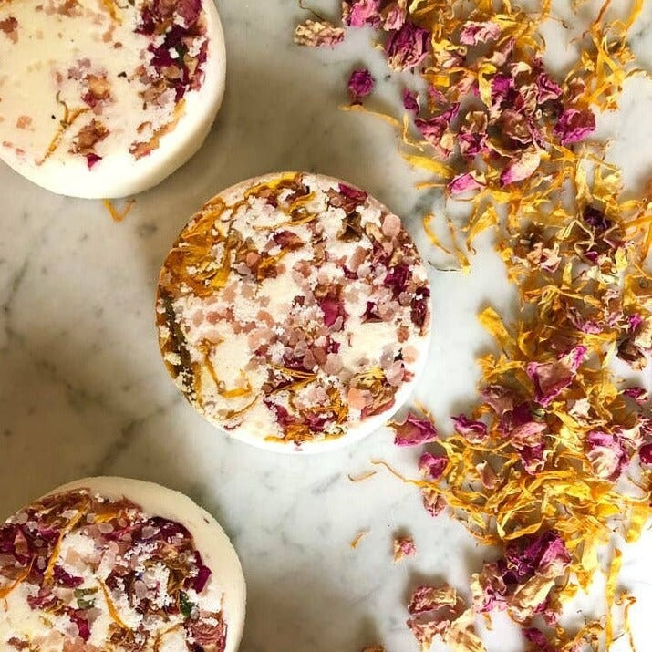 Ingredients: sodium bicarbonate, citric acid, pink Himalayan sea salt (coarse), seaweed extract, essential oils (grapefruit, lemon, sweet orange), polysorbate 80, witch hazel, dried marigold, dried rose petals.
