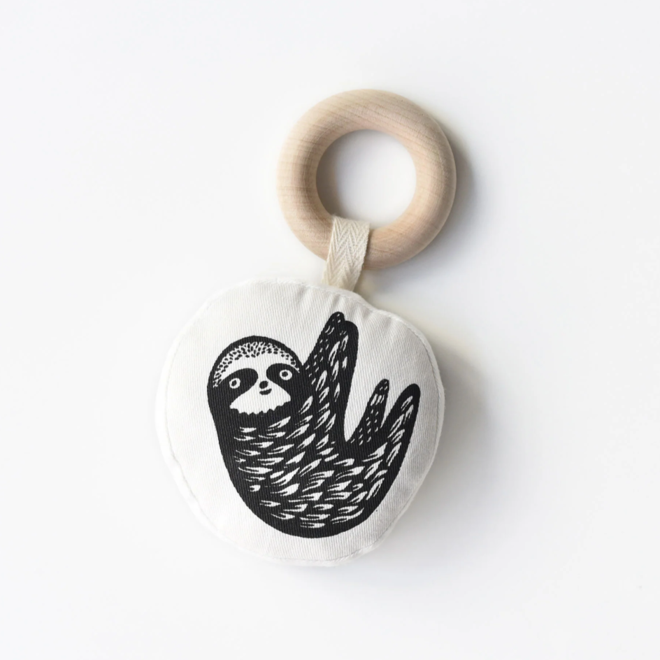 Bring out the smiles with this adorable organic cotton rainforest Sloth teething toy. Our sustainably made teether is sized perfectly for tiny hands, with our signature high-contrast illustrations, 100% organic cotton fill and outer shell, and an eco certified maple wood teething ring.