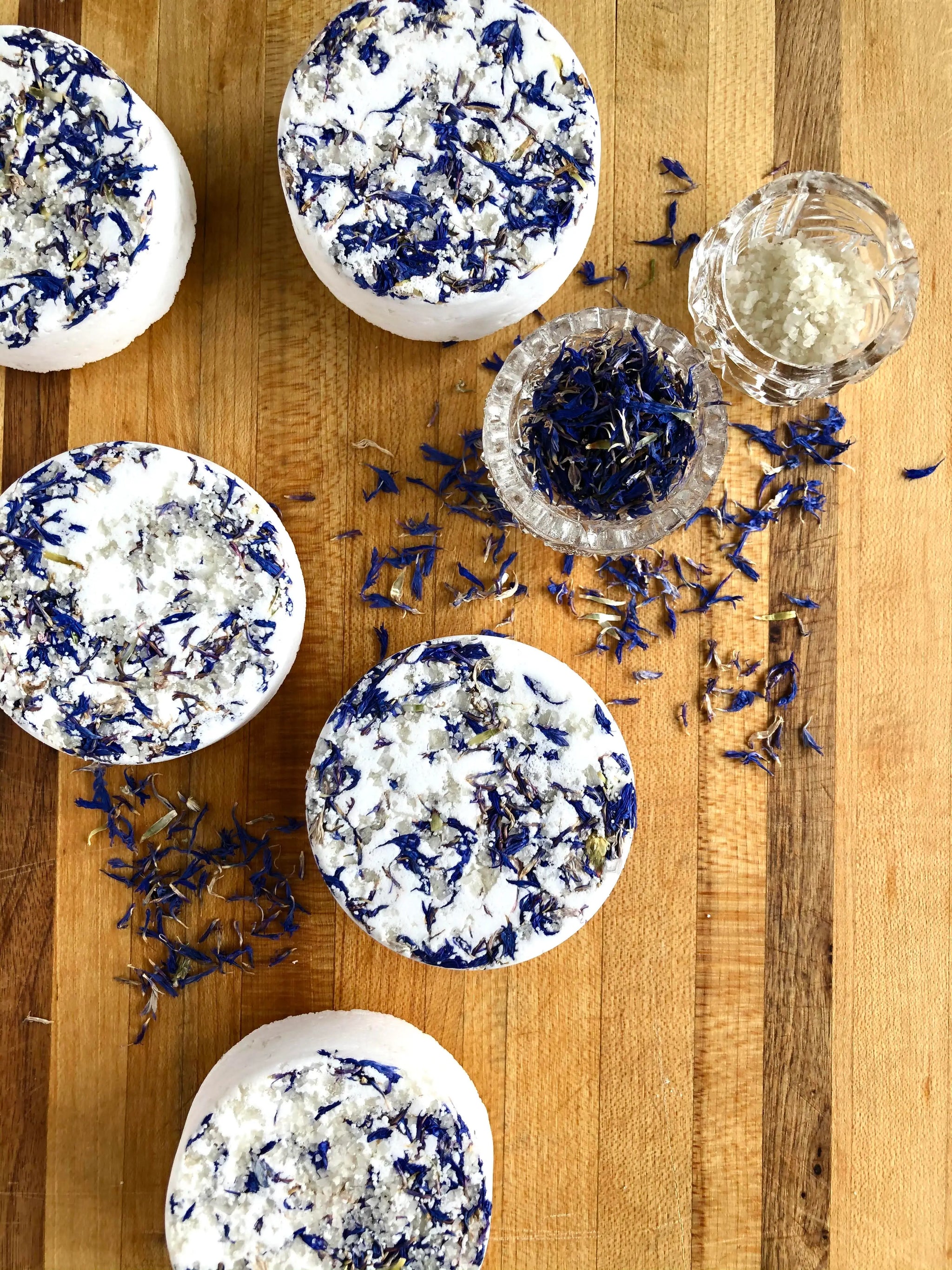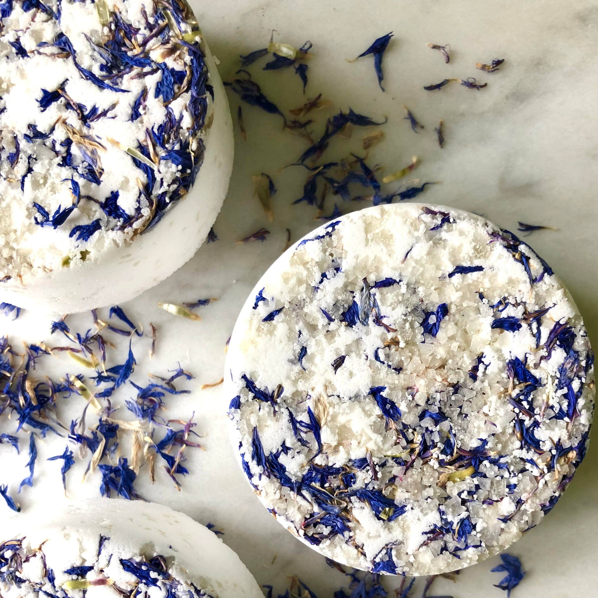 Ingredients: sodium bicarbonate, citric acid, french gray sea salt (coarse), seaweed extract, lavender essential oil, polysorbate 80, witch hazel, dried cornflowers
