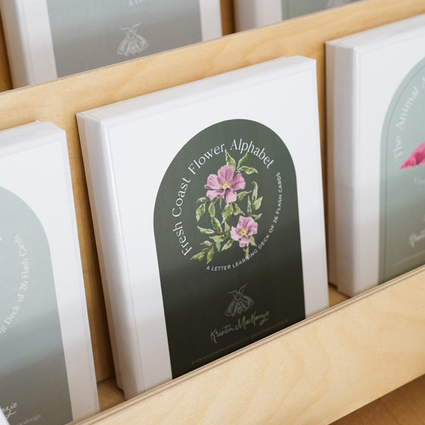 Each set includes: A set of 26 flash cards featuring our original floral designs, originally painted in gouache & watercolor, professionally printed on heavy, coated card stock. (They’re easy to keep clean from those little sticky fingers)