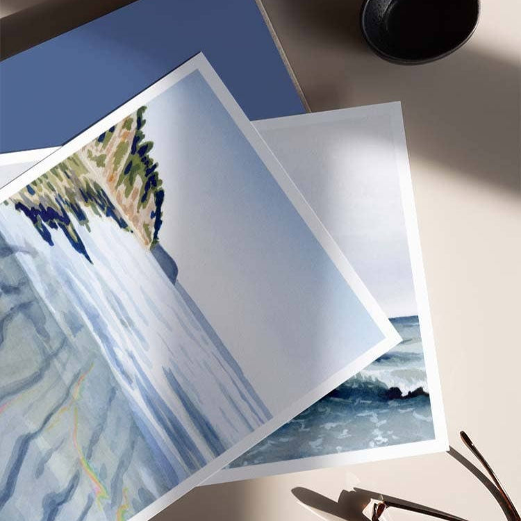 Set of 8 folded notecards featuring original Fresh Coast watercolor designs. 2 of each “Morning Reflections”, “Winter Waves”, “Cloudy Day in Frankfort”, and “Distant Rain” notecards professionally printed using a digital press on white card stock