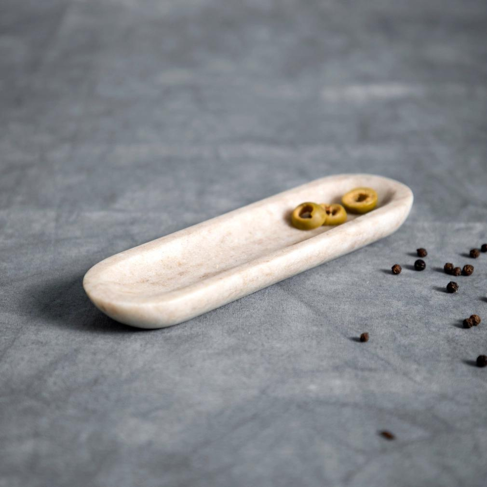 This delightful canoe-shaped vessel is carved, shaped and polished by hand from natural marble, ensuring no two will be exactly alike. Rounded ends and a shallow body make it a perfect serving solution for olives, nuts or antipasti, though it would also be right at home atop a dresser as a unique catchall. Handmade in India
