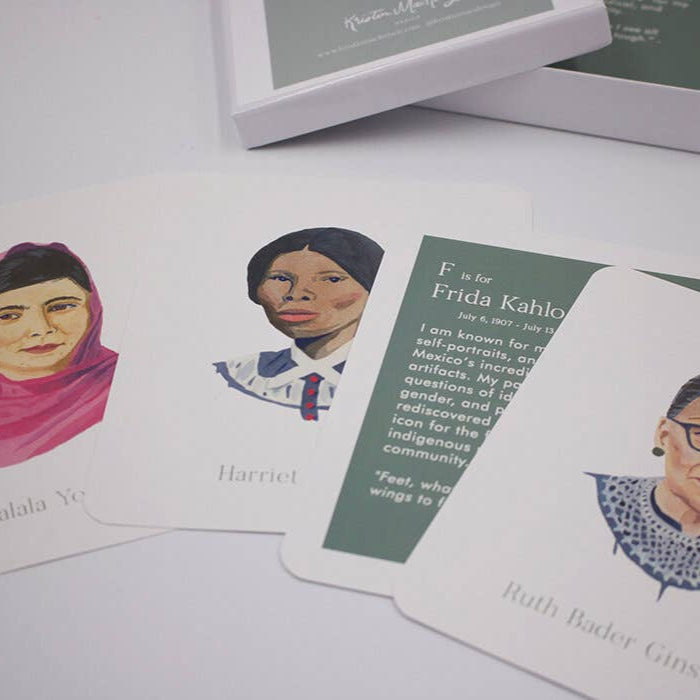 Each card features an inspirational woman’s portrait on the front, and the corresponding snippet of her story on the back. The flash cards come packaged in a sturdy white box so you can easily keep the set together.