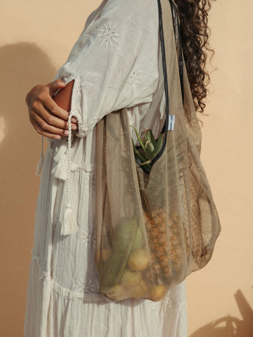 Joan Reusable Mesh Tote Bag In Tan/Black