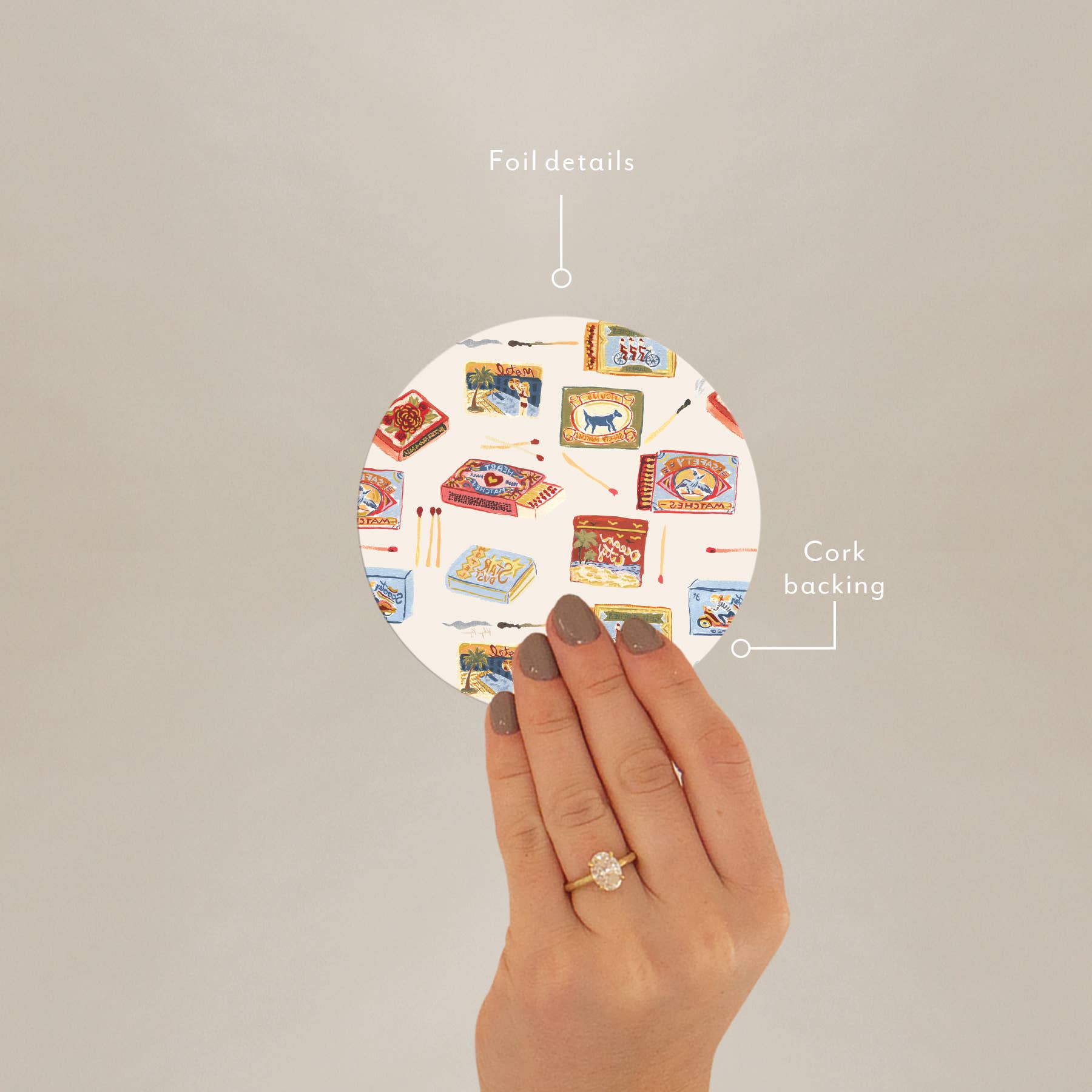 These beautiful loose coasters feature hot foil stamped designs, which are corked-backed and heat + water resistant. Buy them as a party favor, event give-away or swag bag. Your coffee table's new best friend and sure to elevate your dinner party's tablescape. Made in the U.S.A.