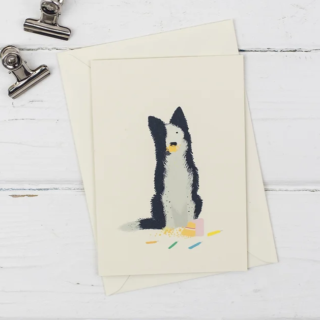 This cheeky little collie is already tucking into the birthday cake - birthday candles scattered everywhere! A fun way to wish someone a very happy birthday