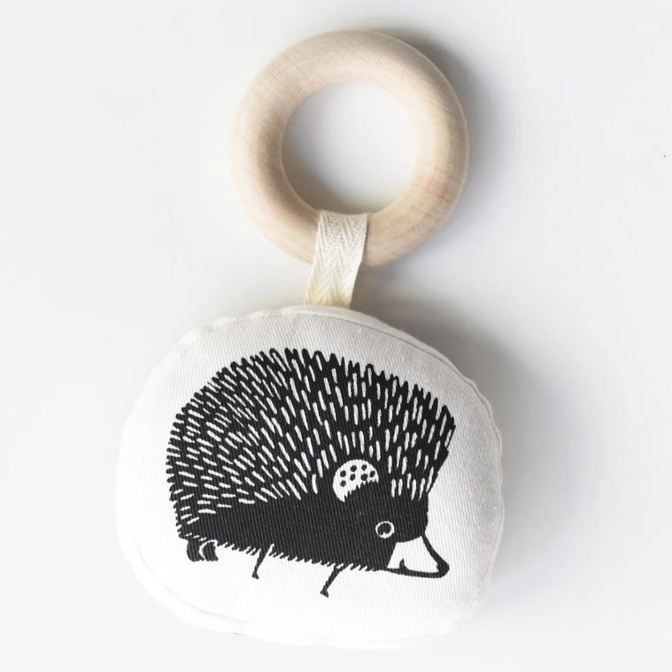 Bring out the smiles with this adorable organic cotton rainforest Hedgehog teething toy. Sustainably made teether is sized perfectly for tiny hands, with our signature high-contrast illustrations, 100% organic cotton fill and outer shell, and an eco-certified maple wood teething ring.