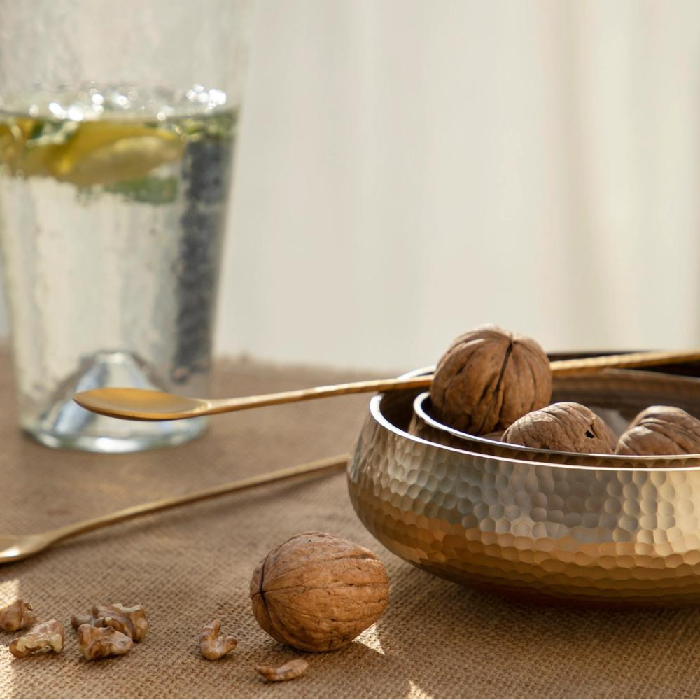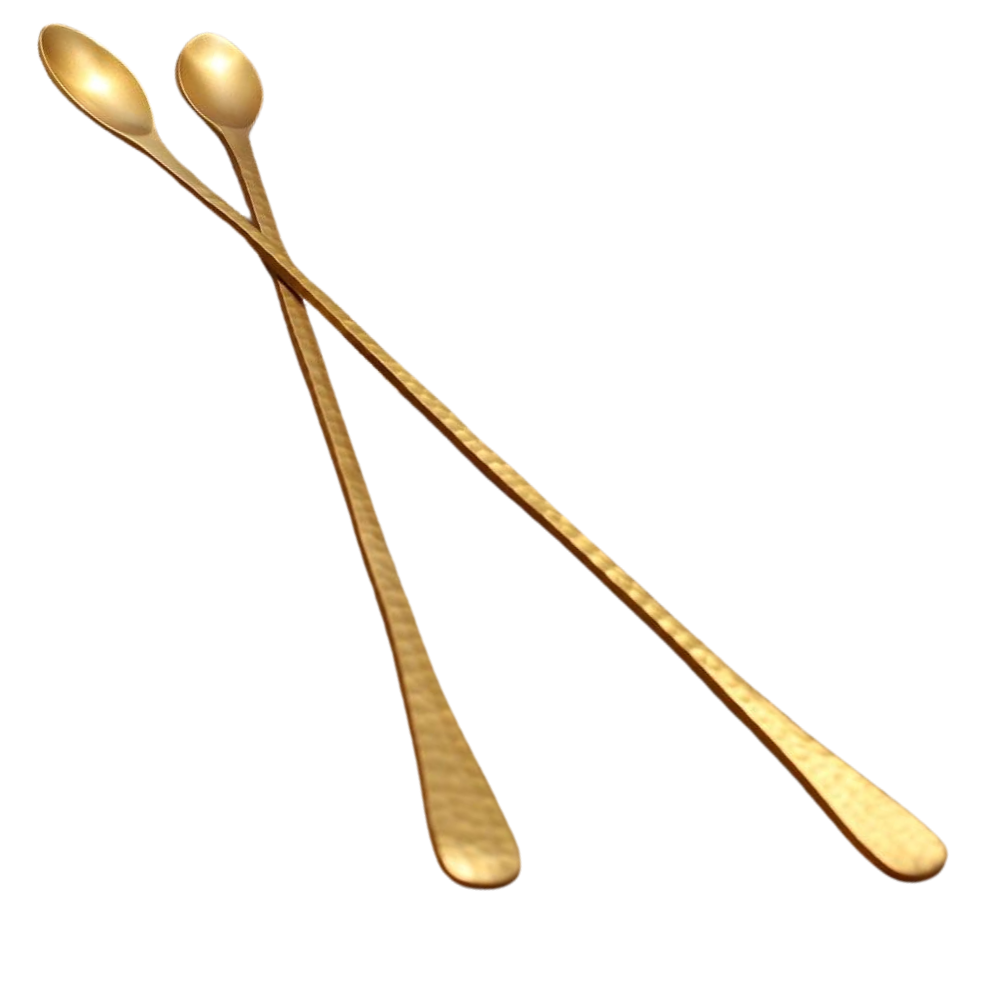 Long brass bar spoons bring modern flair to your bar with their elongated silhouettes, gently hammered texture and matte golden hue. Use them in your tallest glassware and pitchers to guarantee no ingredient gets left behind. Food-safe spoons sold individually. Hand wash only. Handmade in India. Weight: 1 lb (453.59 g)