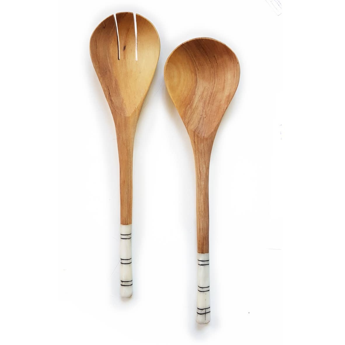 Serve in style with this boldly patterned salad set. Each is hand-carved in Kenya from olive wood and accented with a batiked cow bone handle. We use only ethically sourced cow bone and treat each server with food-safe sunflower oil.