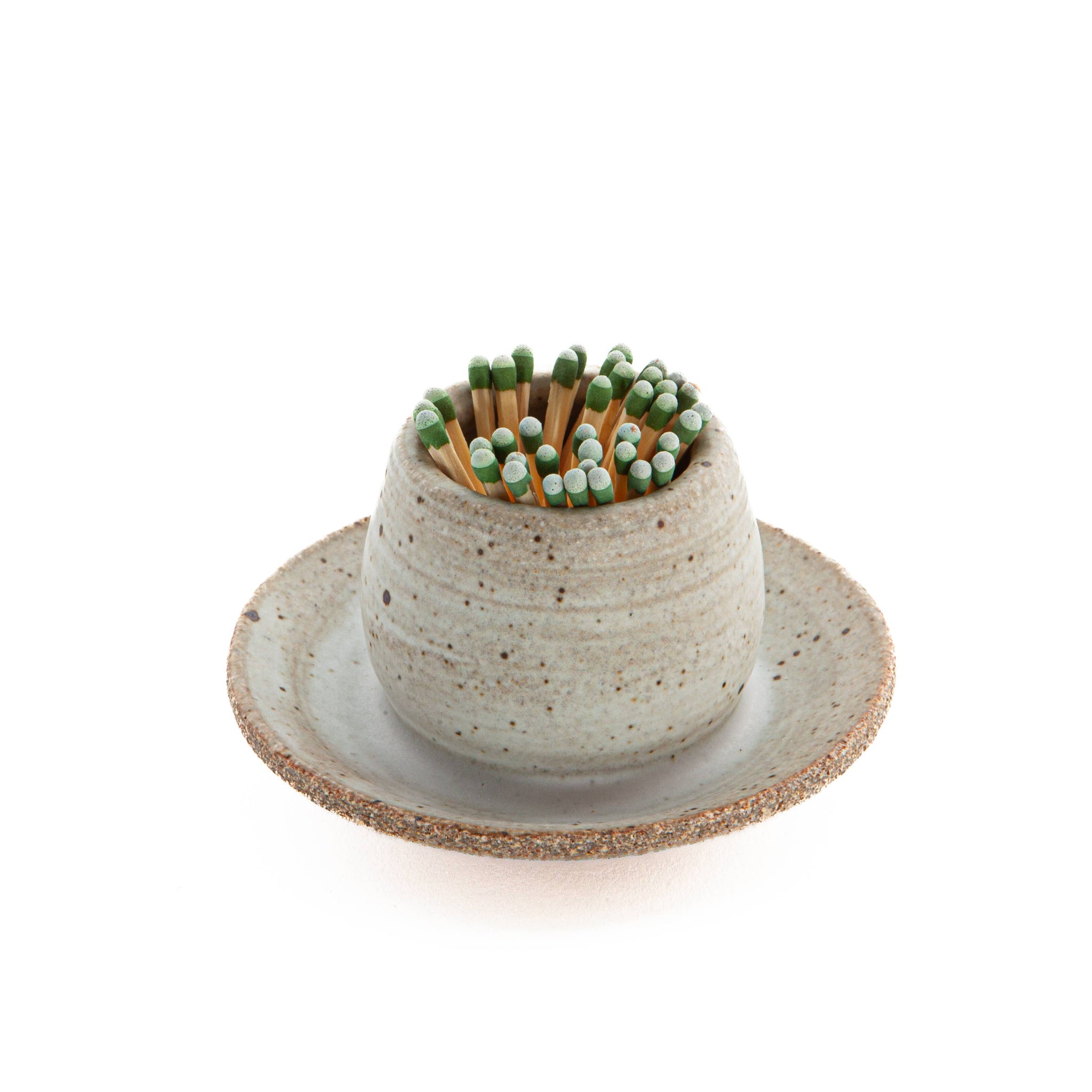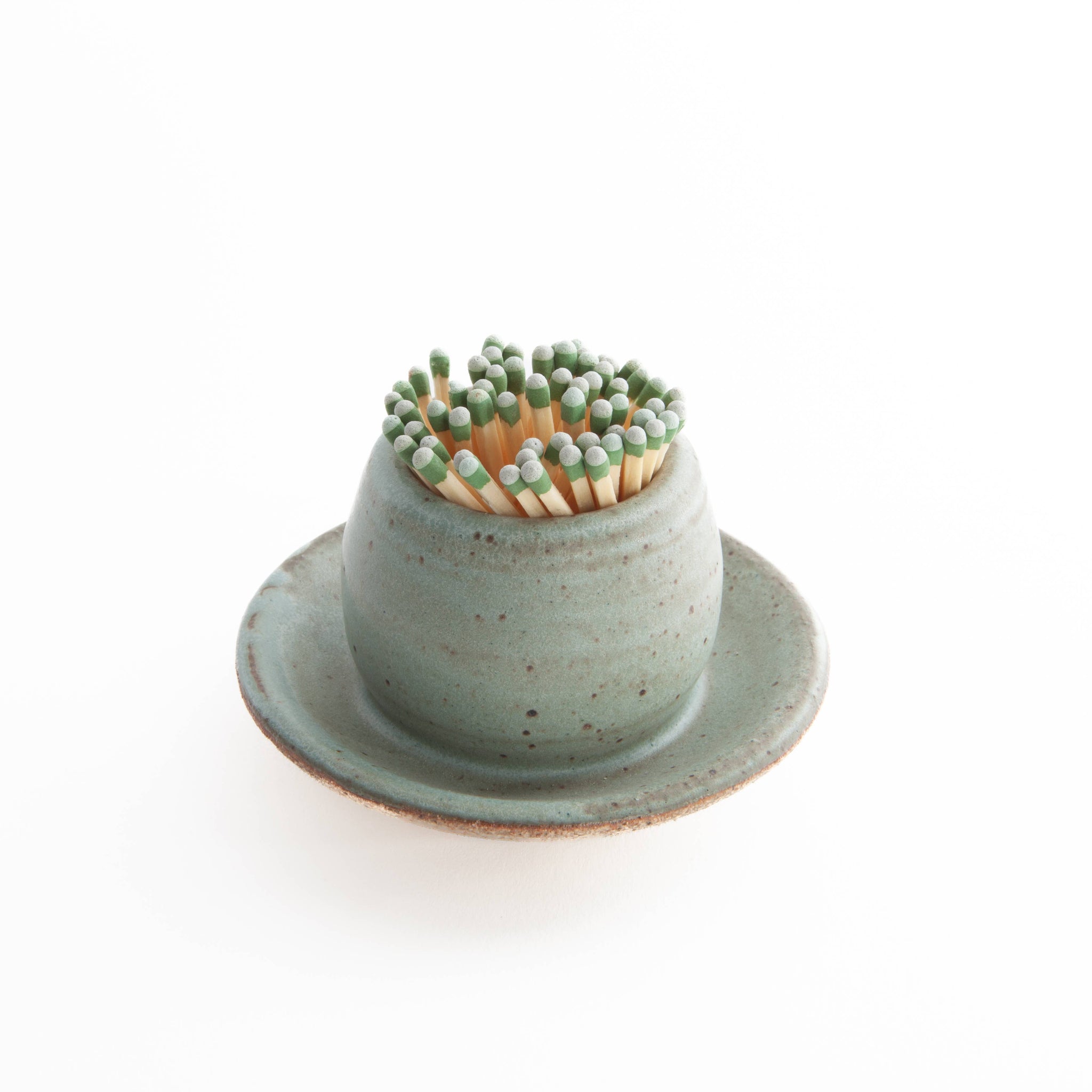 These clever match strikers utilize strike anywhere matches that can be struck on the underside of the attached dish. Available in three glazes: Alabaster, Copenhagen Green and Charcoal.