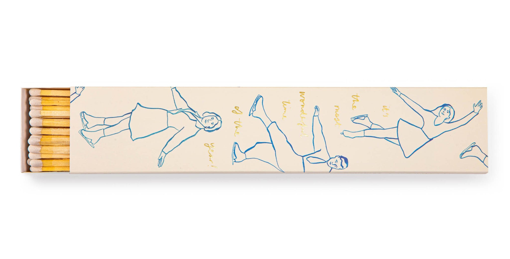 Long matchbox featuring blue line drawings of icedancers with the words 'Its the most wonderful time of year' in gold.